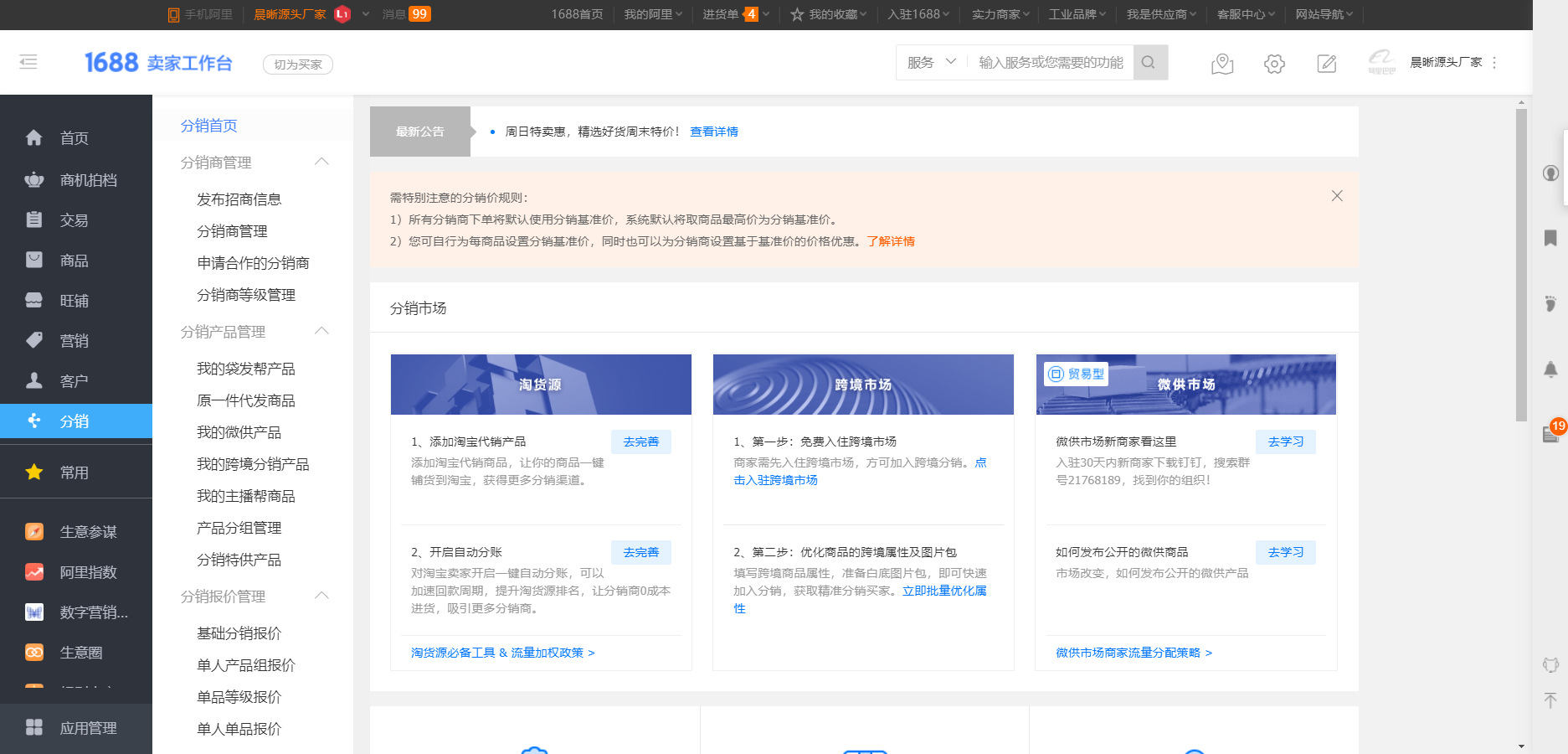 打开阿里后台————分销————分销首页。各位商家可根据自己的需求入驻不同的市场,比如淘货源,跨境市场,微供市场,淘工厂,厂货通等承接了店铺的横向流量,我们应当要熟悉各大市场的入驻标准以及规则,避免雷区。