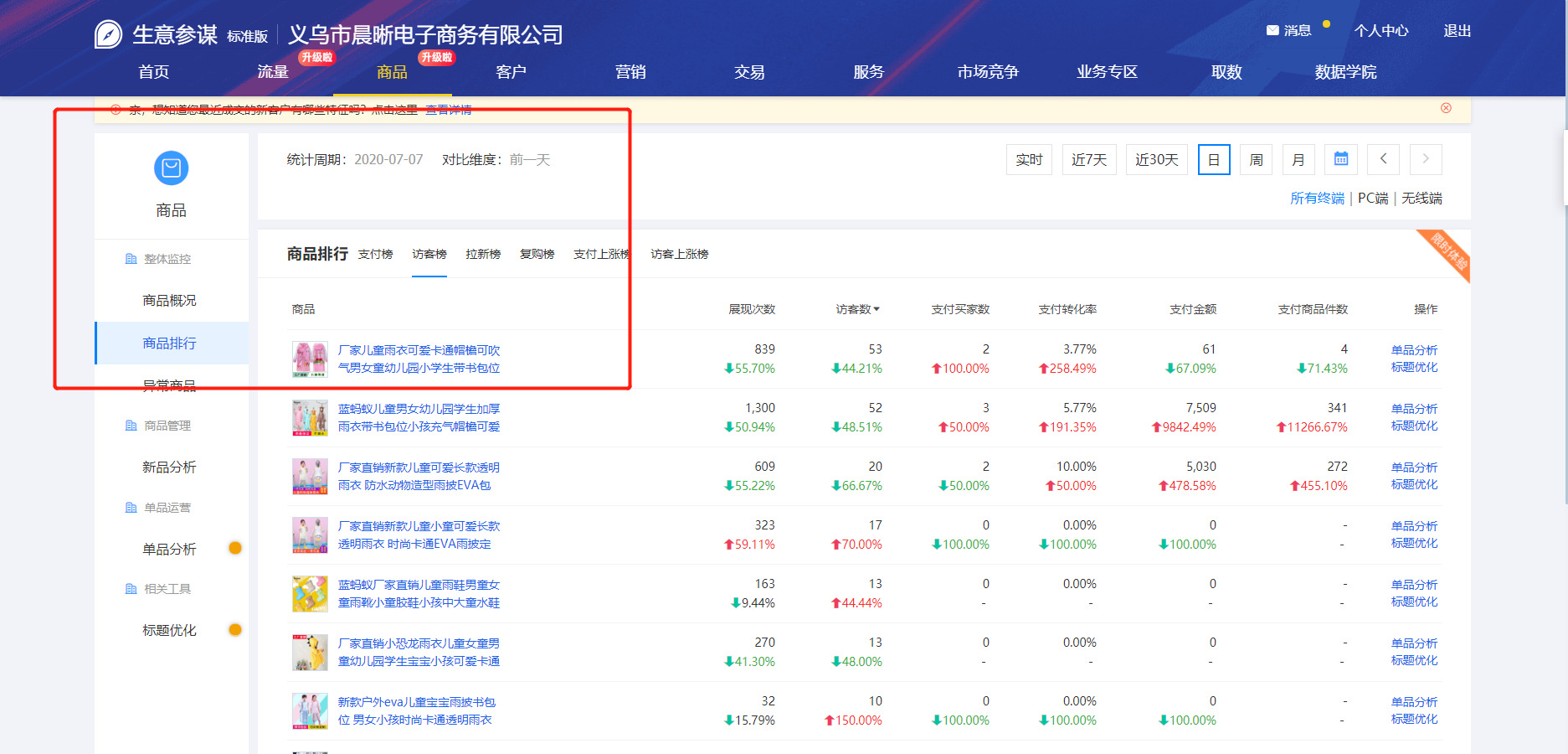 主图是店铺引流的第一门面,做的好了将会是一颗恒星,自带发光源,吸引眼球,点击率蹭蹭的往上涨。我们可以通过生意参谋后台————商品————商品排行,我们可以看到某个产品的展现次数/访客数,如果展现次数很高,但是访客很少,那我们应该适当去优化主图,我们如果没有灵感的话,前期我们可以去阿里同行或者淘宝天猫平台看看同类产品的拍摄手法以及色彩构图。