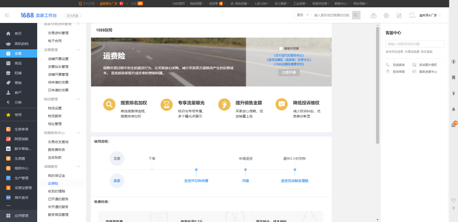 打开阿里后台————交易————保障服务,根据自己店铺产品的实际情况开通,当然开通这些的好处很多,比如搜索排名加权,提高店铺权重以及专享流量曝光等。